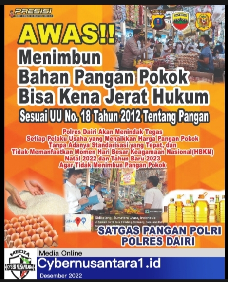 Dairi, Sumut, CYBERNUSANTARA1.ID — Kapolres Dairi Akbp Wahyudi Rahman, S.H, S.I.K, M.M melalui Personil Sat Res Polres Dairi di bawah Pimpinan Kasat Reskrim Polres Dairi AKP Rismanto J. Purba, S.H, M.H, M.Kn. melakukan Pemasangan Spanduk dan Benner terkait larangan penimbunan bahan pokok penting dalam rangka menyambut hari Natal 2022 dan tahun baru 2023 di berapa Titik Pusat Pasar Sidikalang. Senin 19-12-2022.