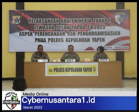 Yapen, CYBERNUSANTARA1.ID — Inspektorat Pengawasan Daerah (Itwasda) Polda Papua menggelar kegiatan audit kinerja Tahap I Itwasda Polda Papua T.A 2023 Aspek Perencanaan dan Pengorganisasian Pada Polres Kepulauan Yapen di gedung mambora Polres Kepulauan Yapen, Kamis (30/3/2023).