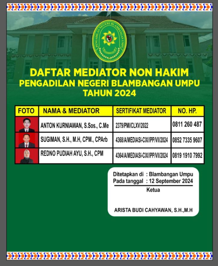 Sugiman dan Redno Pudiah Ayu Alumni Mediasi IPPI – DSI Diterima Sebagai Mediator Non-hakim di Pengadilan Blambangan Umpu